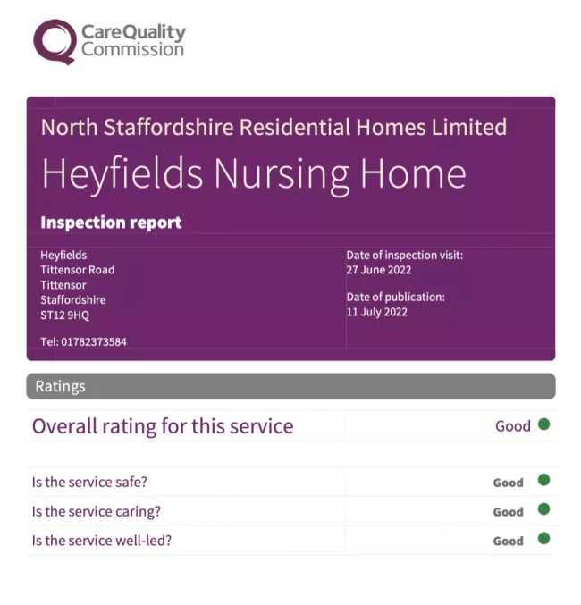 On the 27th June 2022 the Care Quality Commission conducted an inspection of Heyfields Nursing Home. This is a regular process with us being last inspected in June 2019. The CQC inspectors are assessing our service on three main criteria : – Is the service safe?, Is the service caring? and Is the service well…